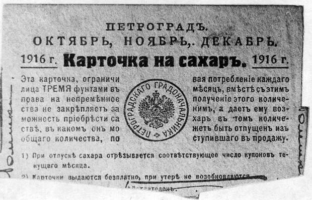 Люди, не интересующиеся темой, не слышали об этом — но самые первые продуктовые карточки появились в России не во времена Перестройки и даже не во времена Второй мировой войны, а больше ста лет назад — весной 1916 года. К этому времени Российская Империя была уже сильно истощена войной, как психологически, так и экономически — в стране начался продовольственный кризис, и была введена карточная система. В частности, существовали талоны на сахар — так как сахаропроизводящие заводы Польши оказались в зоне боевых действий. Эти карточки выглядели вот так: