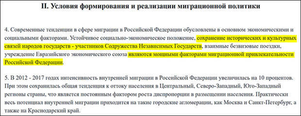 Для главного официального издания Концепцию комментирует заместитель секретаря Совета Безопасности. Этот факт прозрачно намекает на то, какая структура курировала разработку фундаментального документа, определяющего каркас миграционной политики на 2026-2030 годы. Когда за дело взялись "безопасники", ситуация нормализовалась - и мы получили внятную, правильную бумагу. Совсем не так обстояло дело с предыдущей Концепцией, "перлы" из которой вы можете увидеть выше на скриншотах.