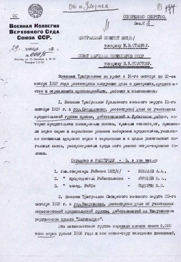 Это справка Военной коллегии Верховного суда Сталину и Молотову о деятельности военных трибуналов.