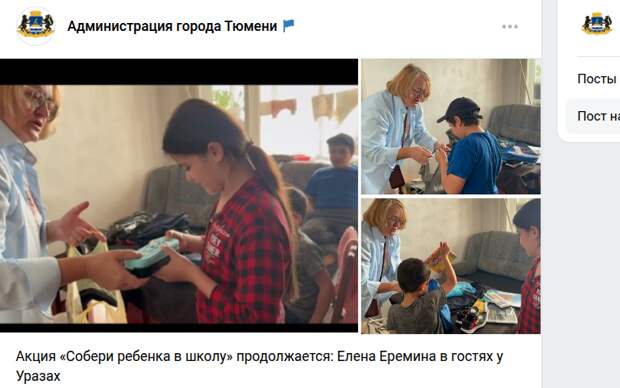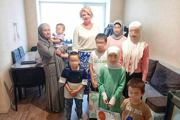 В официальных аккаунтах появились фотографии: вот директор департамента имущественных отношений Ольга Федоренко вручает канцелярские наборы семье Кафаровых, где семеро детей. Девочки собираются идти в школу, видимо, в хиджабах - как позируют на фото.