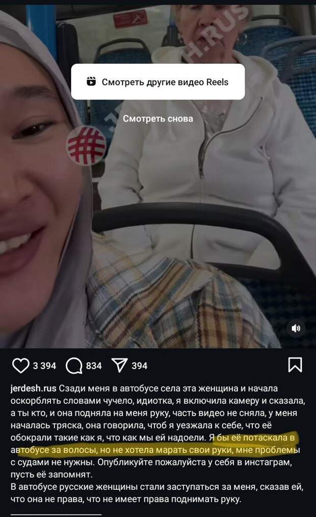 «Она смеётся над пожилой женщиной, снимает. Сейчас покажет своим замоташкам. Для них это престижно. Они же унизили русскую женщину, это же по-мусульмански. А то, что они не платят так за проезд, так проезд подорожал из за них»