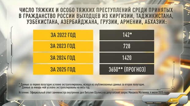 В июле этого года стало известно, что уровень преступности среди "паспортизированных мигрантов" с 2022 по 2025 год вырос в 26 раз. Есть о чём задуматься.